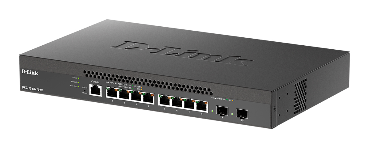The D-Link DXS-1210-10TS 10 Gigabit/Multi-Gigabit Ethernet Smart Managed Switch is a cost-effective 10 Gigabit switch capable of servicing a range of network needs in any business. With high performance and low latency, the DXS-1210-10TS fulfills the needs for virtualization, cloud services, and server-to-server applications, making it perfect for Small-to-Medium-Business (SMB) customers.