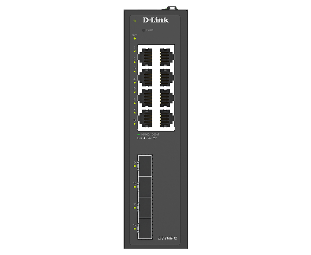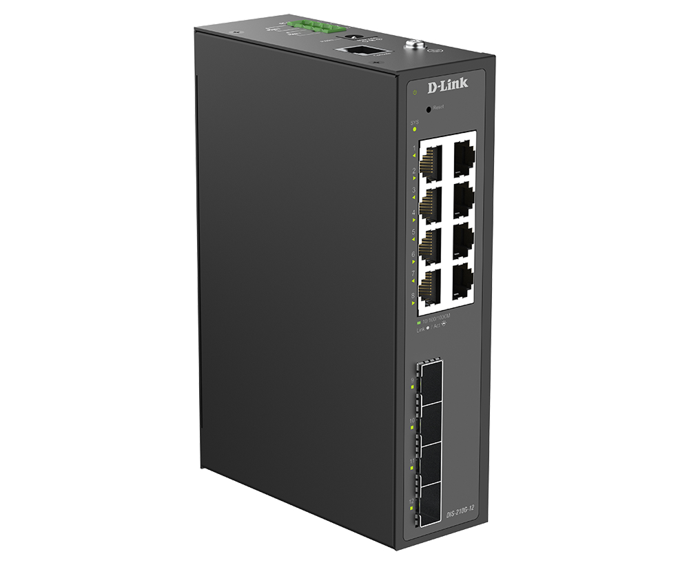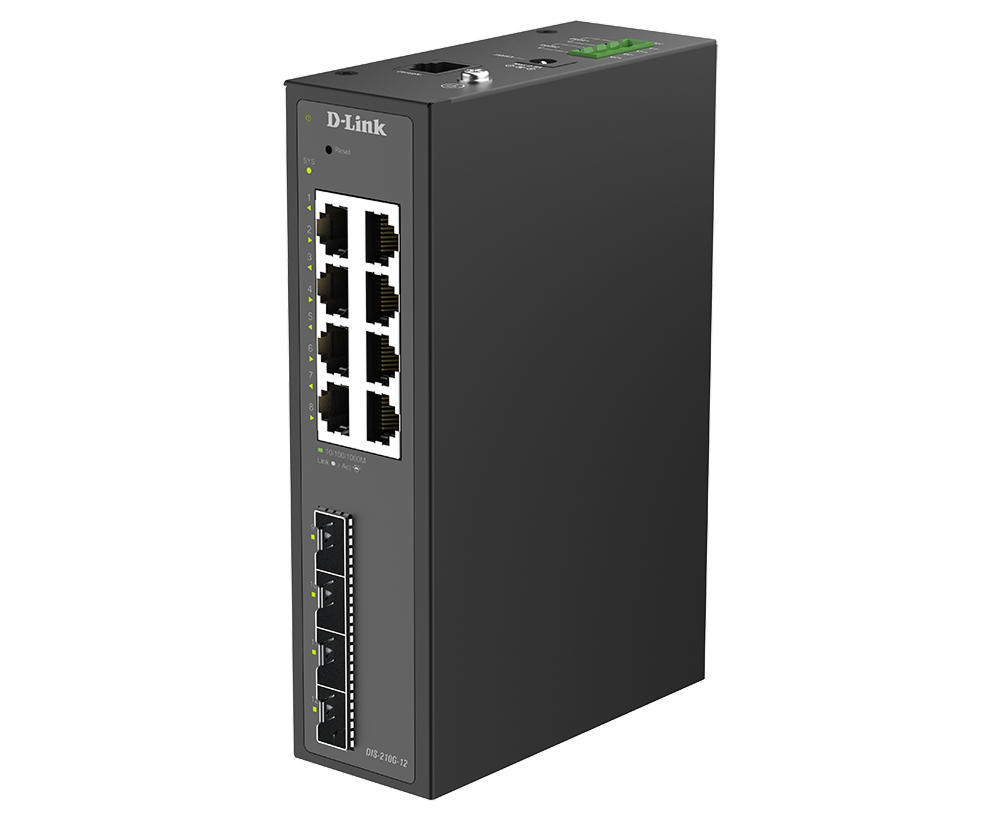 Промышленный управляемый L2 коммутатор DIS-210G-12, оснащенный 8 портами 10/100/1000Base-T, а также 4 портами 1000Base-X SFP, которые используются для организации подключения к высокоскоростной магистрали, предназначен для применения в сетях промышленных предприятий. DIS-210G-12 поддерживает расширенные функции управления и безопасности. Функции управления включают SNMP, управление на основе Web-интерфейса и интерфейс командной строки (CLI).