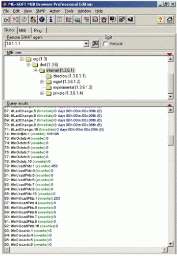 На данном примере видно, что счетчик 72: ifInOctets.1 (counter) числа принятых байтов на Ethernet интерфейсе равен 105195 байтам. Считчик числа переданных байтов Ethernet интерфейса называется ifOutOctets.1 Аналогичную информацию можно получить и по остальным интерфейсам.
