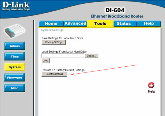 - Переходим на страничку "Tools" -> "System", нажимаем кнопку "Reset to Default" - на рис.1 показано стрелкой