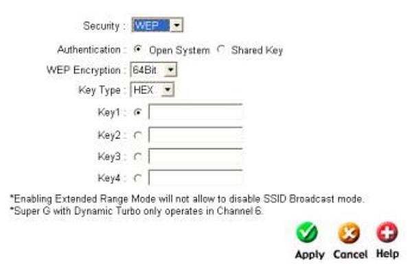 Наиболее простой способ шифрования данных - использование WEP (Wired Equivalence Privacy) протокола. При этом возможно использование 64-битного, 128-битного и 256-битного ключа (опция WEP Encryption). Чем больше количество бит ключа, тем длиннее ключ. Опция Key Type устанавливает тип ключа HEX (шестнадцатеричный) или ASCII (строковый).