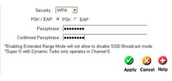 Более криптостойким методом считается шифрование WPA (Wi-Fi Protected Access), при этом подключенные устройства должны поддерживать протокол 802.11g. Чтобы установить WPA шифрование необходимо в пункте Secuirity из списка выбрать WPA.