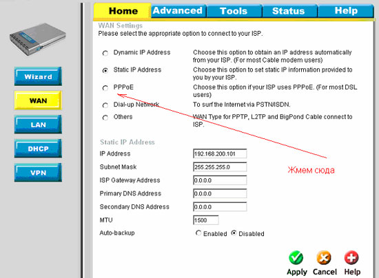 b) Функция "Auto-backup" - этот пункт присутствует только у устройств, оснащенных дополнительным последовательным портом (устройства DI-804HV, DI-808HV, DI-824VUP+) и позволяет включить режим автоматического установления резервного соединения через dialup-модем , подключенный к этому порту, в случае пропадания связи с провайдером через основное соединение.