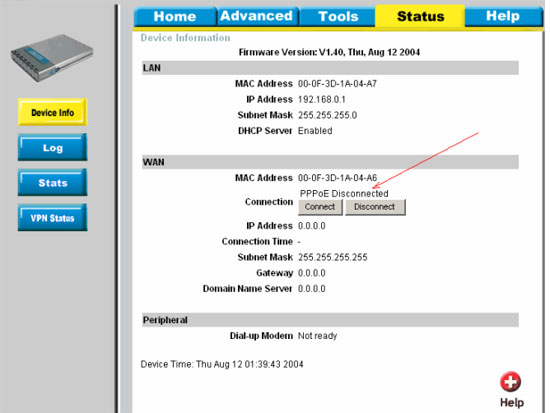 - a) Видим сообщение "PPPoE disconnected" (показано стрелкой) - нажимаем кнопку "Connect".