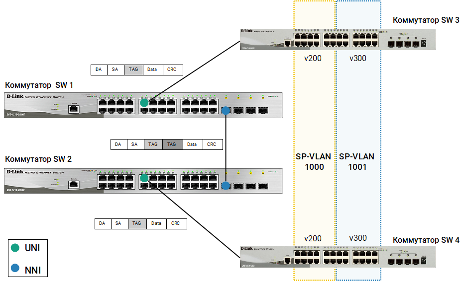 Рассмотрим подключение двух клиентских VLAN к граничным коммутаторам провайдера. Каждому клиенту провайдером назначен уникальный идентификатор: SP-VLAN 1000 для клиента CVLAN 200 и SP-VLAN 1001 для клиента CVLAN 300.  Порты 9 обоих граничных коммутаторов служат для подключения к пользовательским сетям (UNI-порты), передача данных в сеть провайдера осуществляется через порты 25 (NNI-порты).