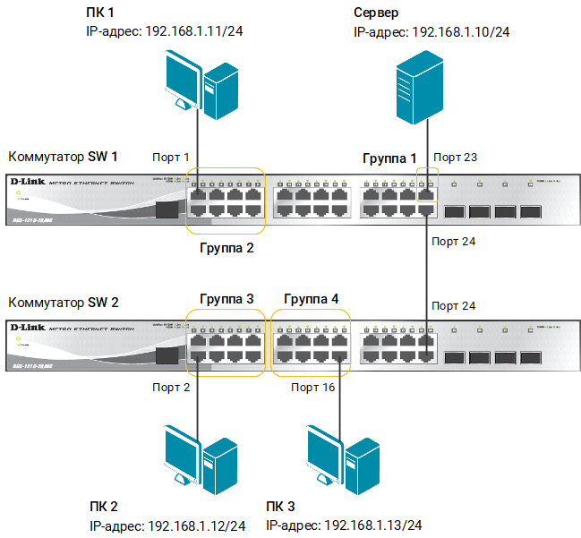 Необходимо настроить коммутаторы таким образом, чтобы рабочие станции из разных групп получили доступ к совместно используемому серверу. При этом обмен данными между устройствами разных групп запрещён.