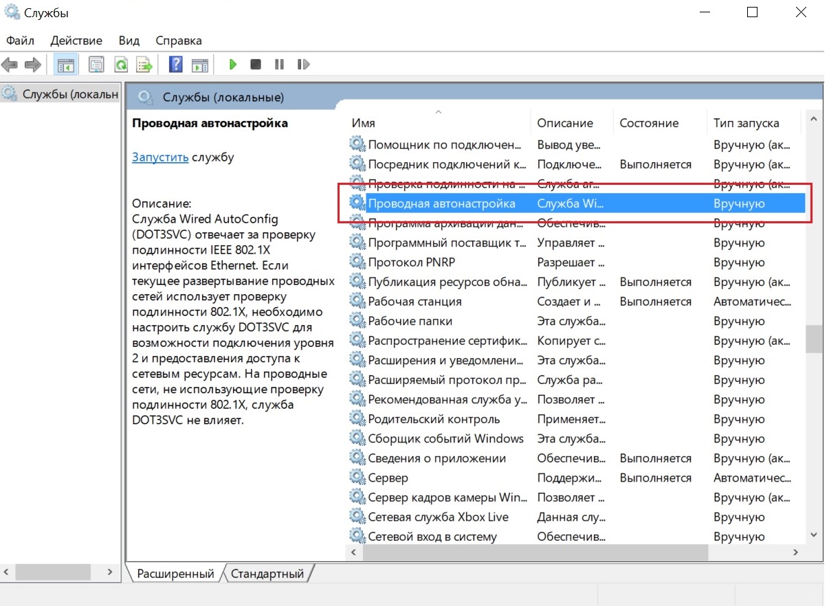 - Выберите в списке службу Проводная автонастройка и двойным щелчком мыши откройте окно настроек.