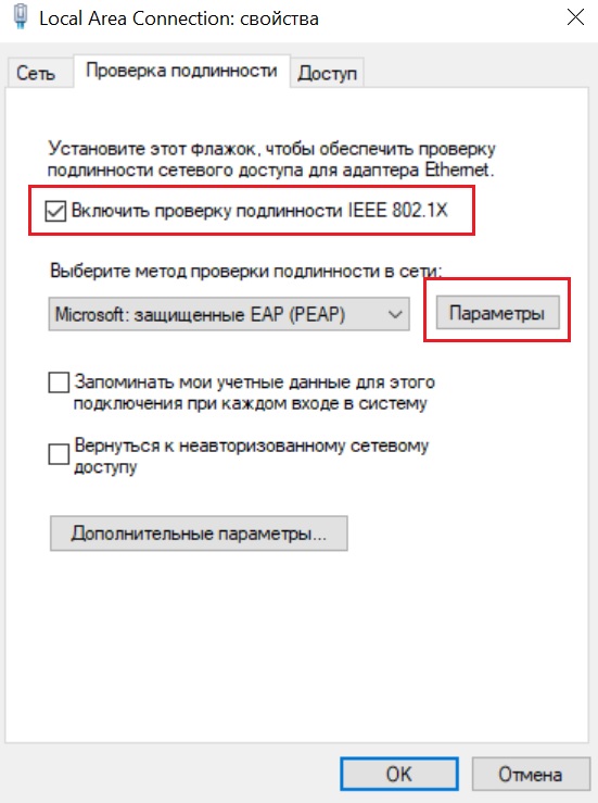 - Во вкладке Проверка подлинности установите галочку Включить проверку подлинности IEEE 802.1X. Нажмите кнопку Параметры.
