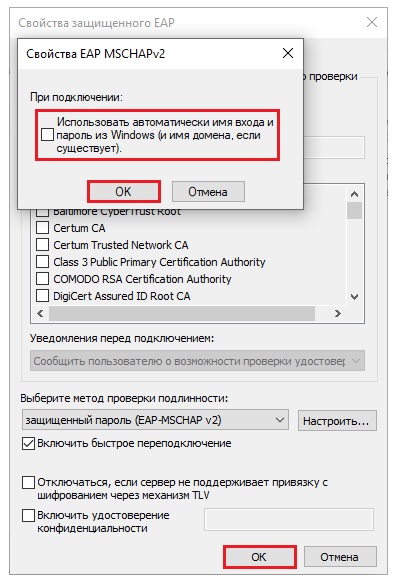 - В открывшемся окне снимите галочку Использовать автоматически имя и пароль из Windows и нажмите кнопку ОК. В окне Свойства защищенного EAP нажмите кнопку ОК.