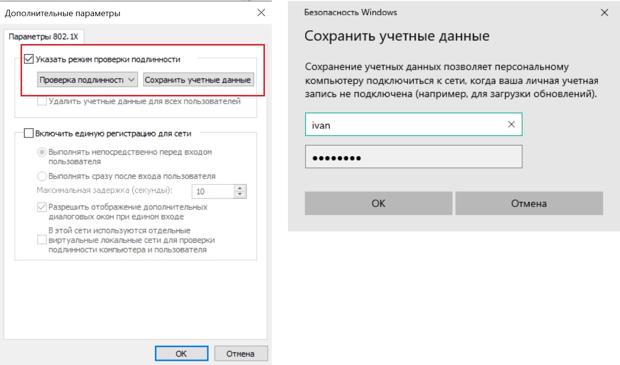 - Во вкладке Проверка подлинности нажмите кнопку Дополнительные параметры. В открывшемся окне установите галочку Указать режим проверки пользователя, в выпадающем списке Проверка подлинности выберите параметр Проверка подлинности пользователя и нажмите кнопку Сохранить учётные данные. В открывшемся окне введите имя пользователя ivan, пароль — ivanpassword. Нажмите кнопку ОК.