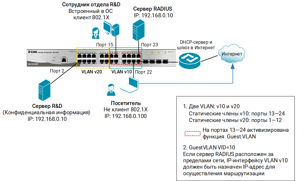 Задача решается настройкой 802.1X Guest VLAN на коммутаторе. Неаутентифицированным пользователям, находящимся в VLAN 10, разрешен доступ в Интернет. После успешной аутентификации пользователей, порты к которым они подключены, будут добавлены в VLAN 20.