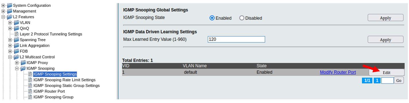 2. Активируйте функции IGMP Snooping и IGMP Snooping Fast Leave в требуемой VLAN (в примере – VLAN по умолчанию). Нажмите кнопку Edit в строке соответствующей VLAN.