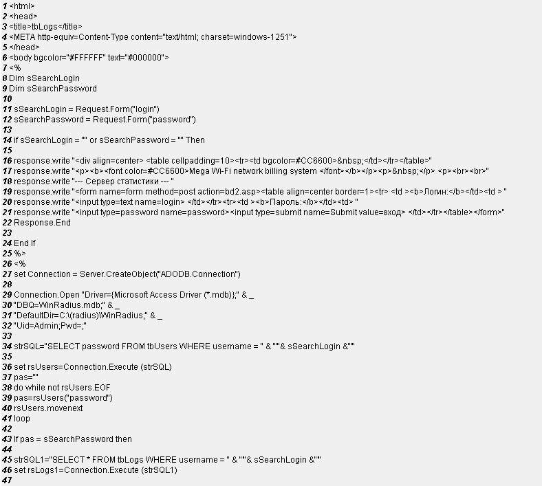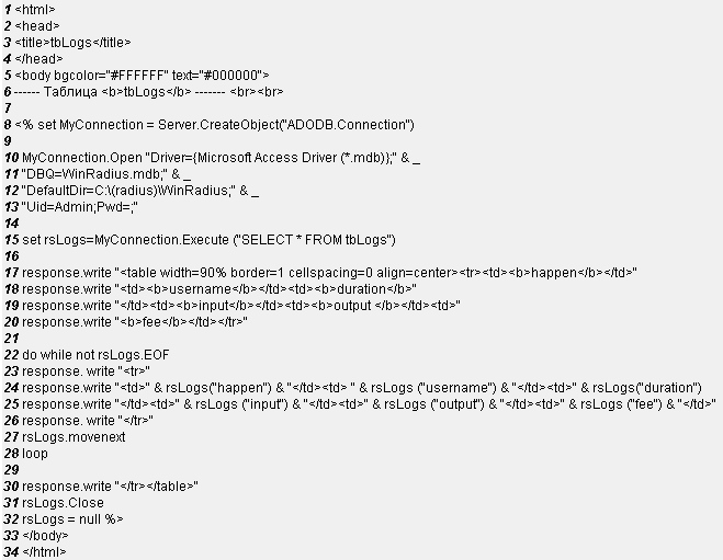 Для начала сделаем страницу со скриптом, который просто обращается к нашей БД и полностью извлекает оттуда содержимое таблицы tbLogs. Делать можно в чём угодно, в том числе и в блокноте (номера строк писать не надо - это для удобства). Файл назовём bd.asp (можно его взять вот [здесь] --> правой мышкой-->сохранить как-->обязательно указать расширение "asp" ---> этот файл нужно скопировать в домашний каталог сайта).