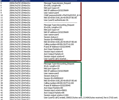 Итак, создаём 5 юзеров (больше к сожалению нельзя - демо версия WinRadius'а не позволяет, но он не единственный на свете, просто он под виндовс и поэтому легко приводить на нём пример), всем назначаем аккаунтинг на базе использованного трафика. Затем пробуем аутентифицироватся: на компьютере, который подключён к Authentification порту DSA-3100, набираем какой-либо URL, шлюз перехватывает его и выдаёт нам форму для аутентификации (всё разумеется под защитой SSL). Процесс аутентификации, начала пользовательской сессии (отмечено красным), а также завершение пользовательской сессии (отмечено зелёным) отображается в окне WinRadius'a: