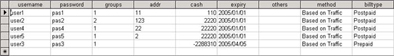 "cash" - cостояние счёта (очень важное поле). Обратите внимание, что у пользователя "user3" значение этого поля отрицательное, а учитывая то, что он тарифицируется по предоплате и то, что вот здесь (Settings--> Authentification-->Prepaid-->Desposit) мы поставили нолик (пользователи у кот будет нулевой или отрицательный балланс будут отключатся), аутентификацию он пройти не может до тех пор, пока не пополнит свой счёт.