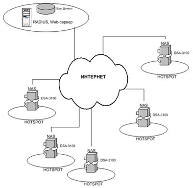 RADIUS (найдём бесплатный или купим) + NAS (DSA-3100) + Access Points (DWL-1700AP, DWL-2100AP, DWL-2700AP, DWL-1040AP+ и т.д.) +WEB интерфейс (напишем сами) = ГОТОВОЕ РЕШЕНИЕ ДЛЯ ОРГАНИЗАЦИИ СЕТИ ХОТСПОТОВ.