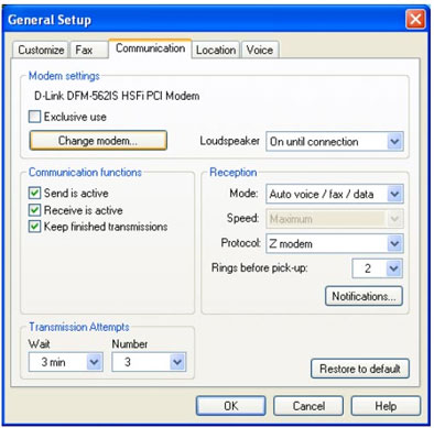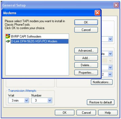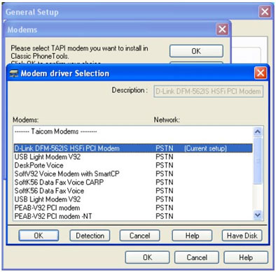 Проверяете, чтобы был выбран "(Current Setup)", т.е. по умолчанию "DFM-562IS HSFi PCI Modem"