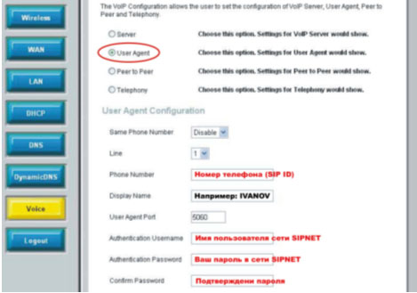 6. На той же странице выберите пункт User Agent для настройки Вашего аккаунта на сервере SIPNet: