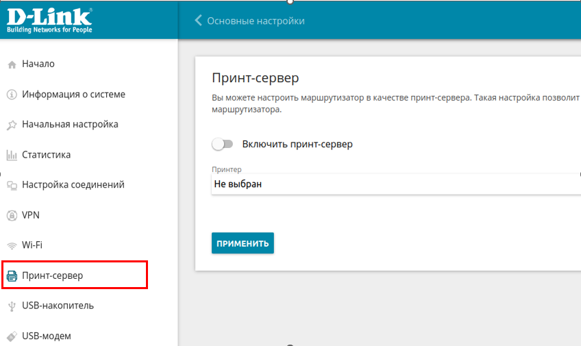 - В Web-интерфейсе маршрутизатора в левом меню выберите Принт-сервер.