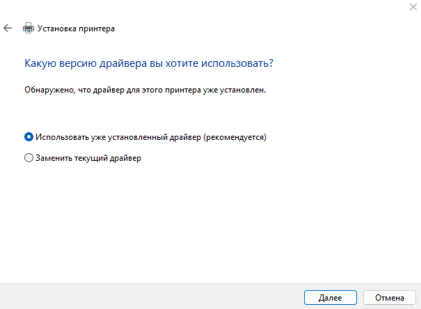 - Выберите Использовать уже установленный драйвер (рекомендуется) и нажмите Далее.