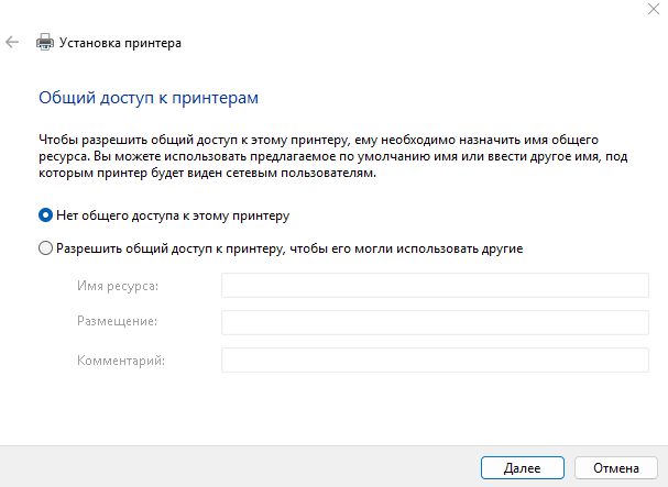 - В окне Общий доступ к принтерам выберите значение Нет общего доступа к этому принтеру и нажмите Далее.