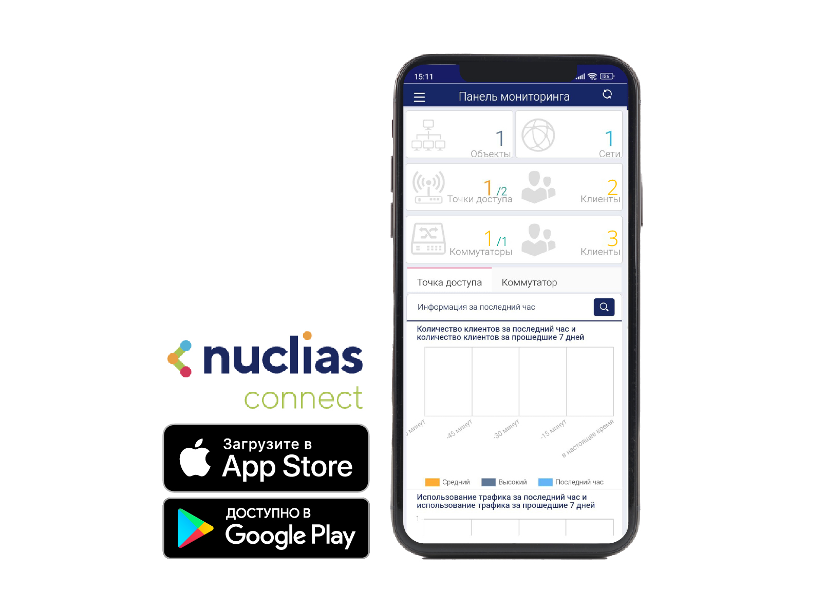 - Гибкое администрирование – поддержка разных уровней доступа администраторов, Web-интерфейс на русском языке, бесплатное мобильное приложение Nuclias Connect для iOS и Android.