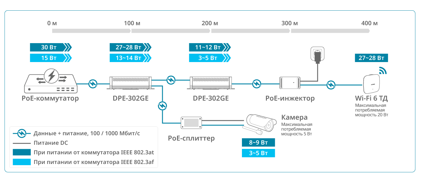 При использовании DPE-302GE в паре с PoE-сплиттером можно подключать к сети и запитывать на больших расстояниях устройства без поддержки PoE, а в паре с PoE-инжектором, например, DPE-301GI, – обеспечить питание удаленных PoE-устройств, требующих повышенной мощности.