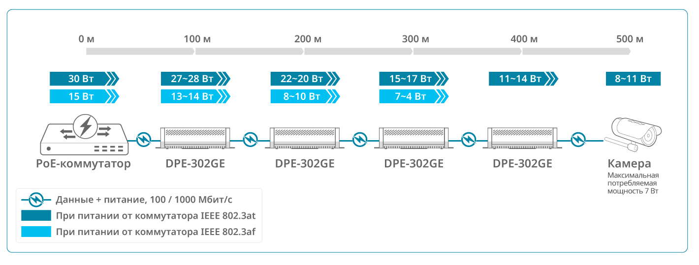 Возможность каскадного подключения до 4 PoE-повторителей позволяет увеличить дальность передачи данных и питания по PoE до 500 м1. Такое решение ускоряет монтаж и снижает стоимость внедрения нового оборудования, поскольку не требует установки дополнительных коммутаторов и подведения к ним питания в промежуточных точках.