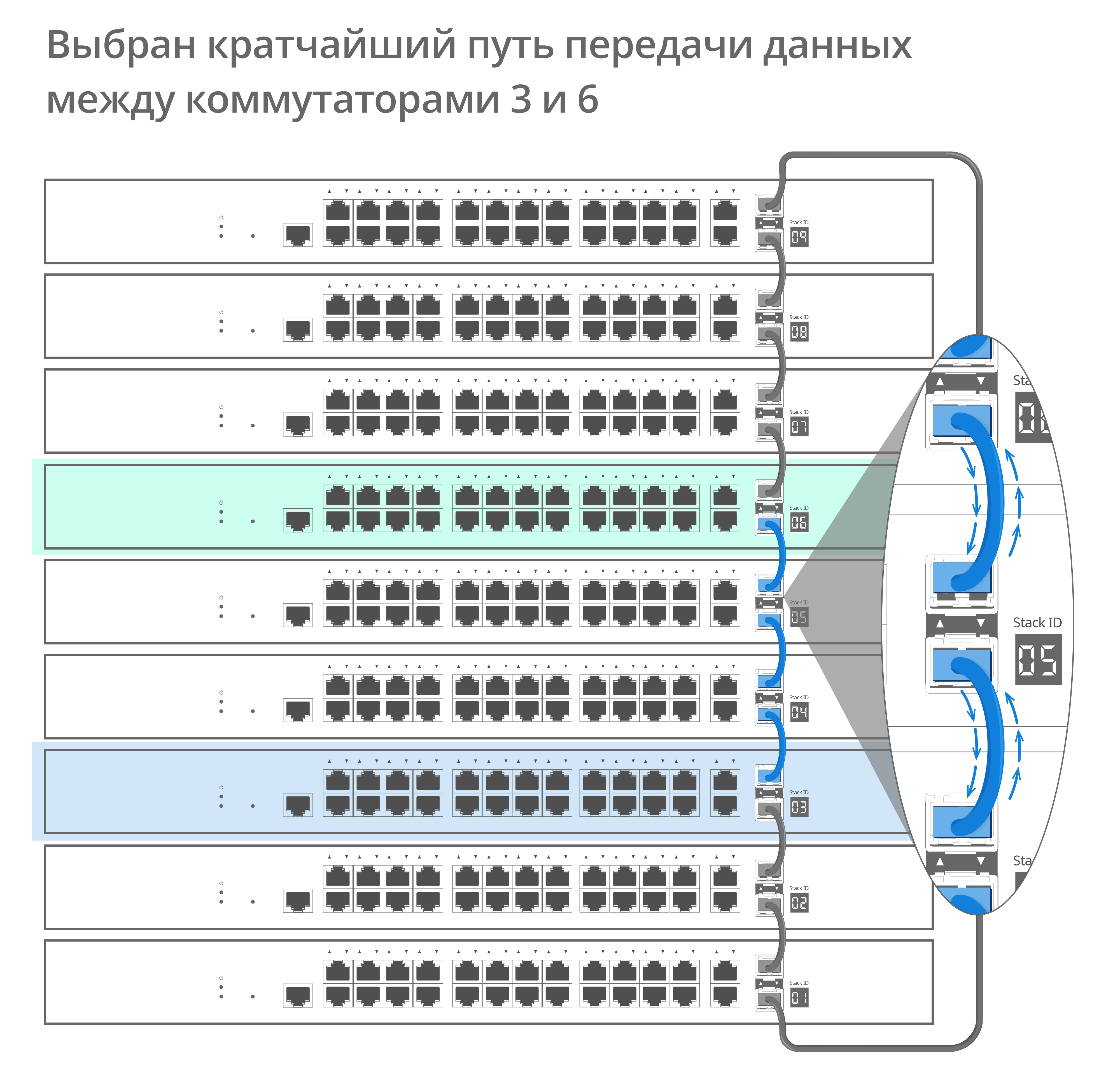 Физическое стекирование объединяет коммутаторы в одно логическое устройство с общими таблицами и единым IP-адресом. Стек по кольцевой топологии обеспечивает передачу данных в двух направлениях. Система автоматически определит оптимальный путь передачи трафика и продолжит работу даже при выходе одного устройства из строя или обрыве связи.