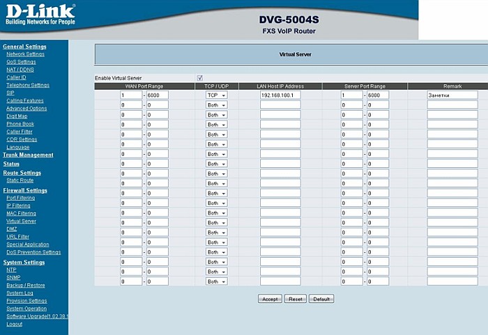 Виртуальные серверы - это дополнительная возможность голосовых шлюзов серии DVG-XXX, предназначенная для предоставления доступа пользователям из Интернет ко внутренним серверам (то есть находящимися за шлюзами в сети LAN), например к почтовым серверам, WWW, FTP и т.д.. Виртуальными они называются потому, что доступ к этим серверам происходит по внешнему (реальному) адресу маршрутизатора, но фактически обращение транслируется на заданный в настройках адрес во внутренней сети. Причем из Интернета могут обращаться к внешнему адресу для получения доступа, например, к FTP и WWW-серверам, физически же эти серверы могут быть на разных компьютерах во внутренней сети.