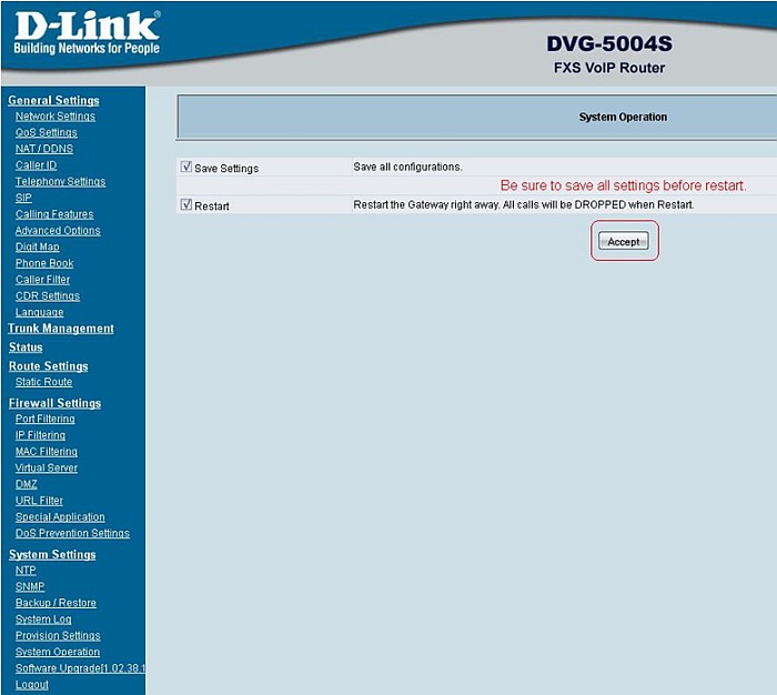 Для того, чтобы настройки вступили в силу, необходимо открыть вкладку System Settings, затем закладку System Operation, далее поставить галочки напротив пунктов Save Settings и Restart, после чего нажать кнопку Accept.