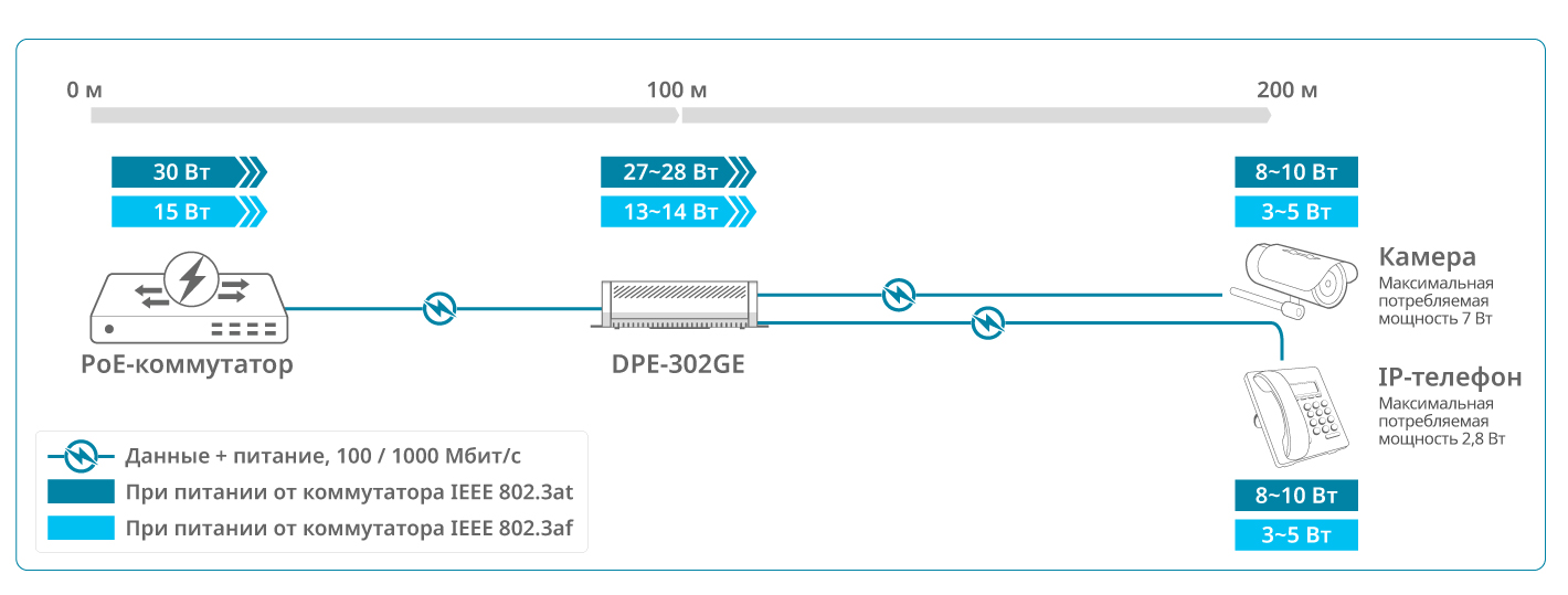 DPE-302GE поддерживает установку Plug-and-Play, автоматически передает питание на два устройства на расстояние до 100 м. Возможность каскадного подключения до 4 PoE-повторителей позволяет увеличить расстояние передачи данных и питания до устройства с поддержкой PoE до 500 м1. DPE-302GE соответствует стандартам IEEE 802.3af/at и поддерживает гигабитную скорость передачи данных, что делает PoE повторитель идеальным решением для сетей с высокими требованиями к пропускной способности. При совместном использовании с DPE-301GS PoE повторитель позволяет запитывать и подключать к сети на больших расстояниях даже устройства без поддержки PoE.
