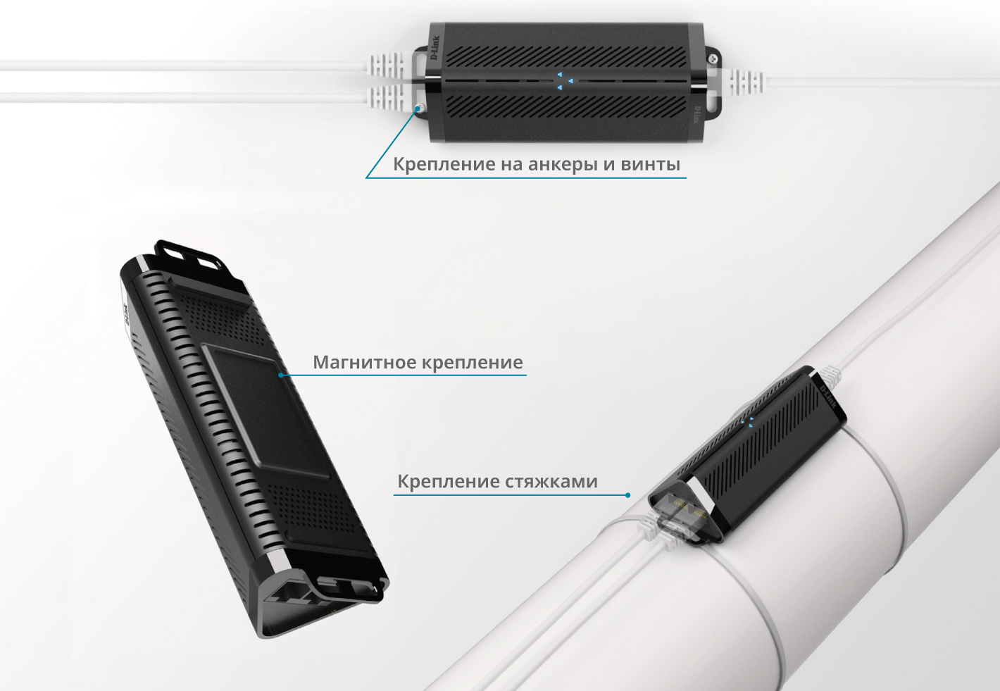 Различные варианты монтажа, удобный дизайн и отсутствие необходимости во внешнем адаптере питания позволяют установить DPE-302GE в любом необходимом месте. Устройство может быть установлено на соответствующей поверхности с помощью встроенного магнита или закреплено на стене с помощью пластмассовых анкеров и винтов, также для крепления могут использоваться стяжки из комплекта поставки. PoE-повторитель позволяет установить сетевые устройства в местах, где розетки питания недоступны. Широкий диапазон рабочих температур (от -20 до 60 °С) открывает дополнительные возможности для эксплуатации устройства.