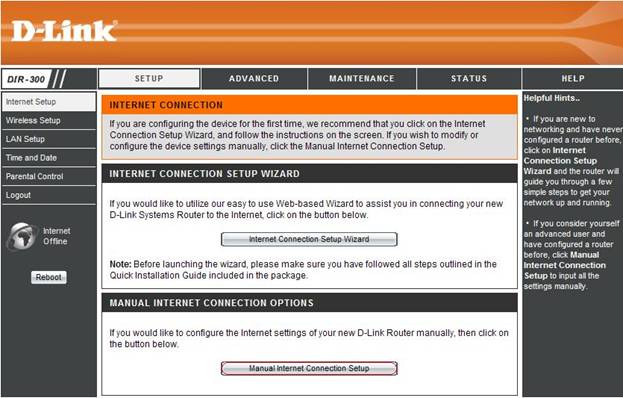 Vahelehel Setup valige Internet Setup.