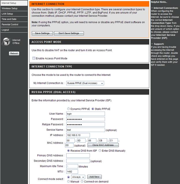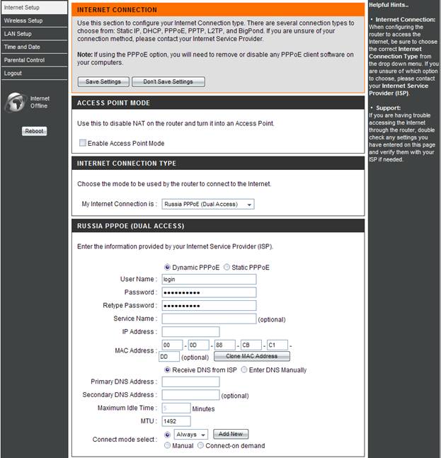 - Connect mode select – ühenduse loomise režiim. Joonisel on valitud "Always-on" püsiühenduse jaoks. „Connect-on-Demand” – ühenduse loomine vajadusel, s.t. Internetti suunatud side ilmumisel, seade loob ühenduse ja katkestab ühenduse, kui ollakse mitteaktiivsed “Maximum Idle Time’is” määratud ajast. “Manual’i” valimise korral luuakse ja katkestatakse ühendus käsitsi.