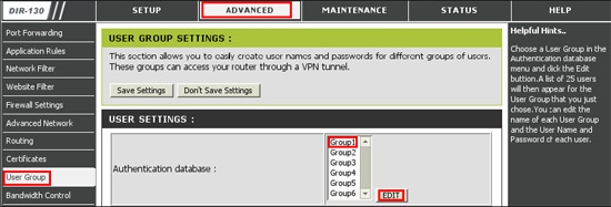 Loome PPTP ühenduse kasutaja. Üleval valige ADVANCED, vasakul User Group, seejärel valige Group1 ja vajutage nuppu EDIT.