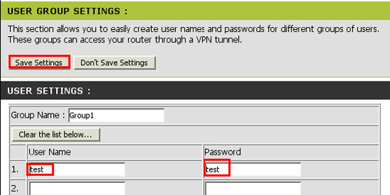 Sisestage User Name väljale kasutajatunnus (näiteks test), Password väljale sisestage kasutaja parool (näiteks test), seejärel vajutage nuppu Save Settings.