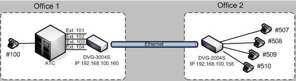 Диаграмма тестовой сети: два офиса (Office 1 и Office 2) находятся в разных городах и соединены между собой IP сетью. Абоненту с номером "100", находящемуся в Office1, необходимо позвонить абоненту с номером "507", находящемуся в Office 2. Абонент с номером "100", набирает на своем телефоне "101" (внутренний номер на АТС, к которому подключен 1-й порту DVG-3004S) и автоматически попадает на абонента с номером "507" подключенного к 1-му порту DVG-2004S. Для того чтобы позвонить абоненту с номером "508", абонент с номером "100" набирает на своем телефоне "102" (внутренний номер на АТС, к которому подключен 2-й пор DVG-3004S) и автоматически попадает на абонента с номером "508" подключенного ко 2-му порту DVG-2004S. И так далее.