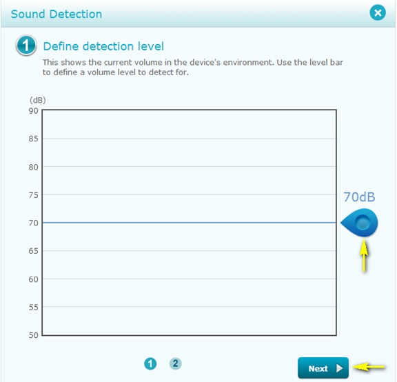 Шаг 5: График отображает текущий уровень фонового звука в окружении устройства. Нажмите и перетащите синий ползунок, чтобы задать нужный порог обнаружения звука. Нажмите Next (Далее), чтобы продолжить.