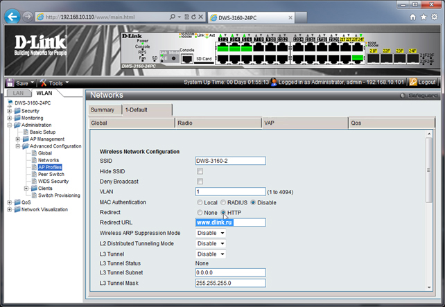 Процедура настройки WEB-редиректа (обязательного перенаправления первого захода клиента на заданный сайт) на комплексном беспроводном решении на основе коммутаторов DWS-3160-24