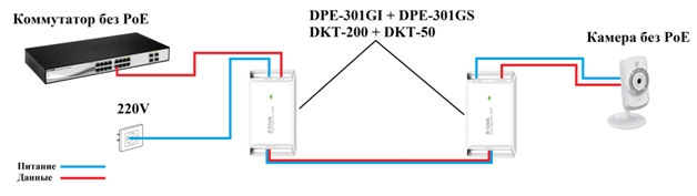 3) Подключение камеры без поддержки PoE к коммутатору с поддержкой PoE