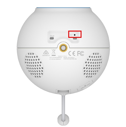 Шаг 1: Не выключая питание устройства, с помощью разогнутой скрепки нажмите кнопку RST (сброс) на нижней панели камеры.