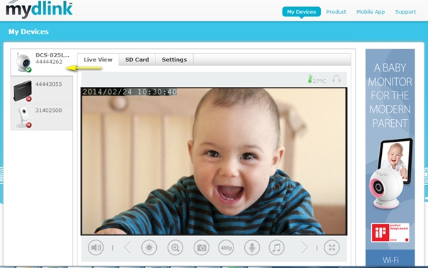 Шаг 2: Выберите камеру с поддержкой mydlink для просмотра видеотрансляции.