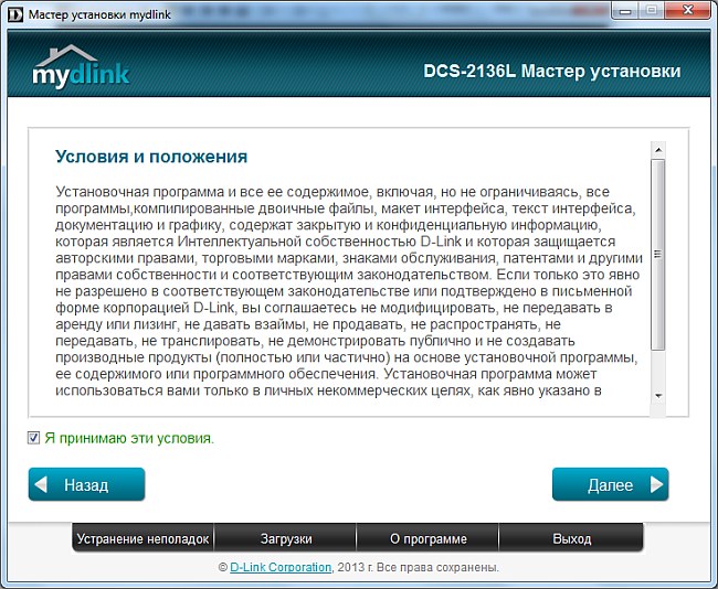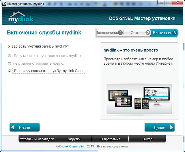 2.7.3: Если вы не хотите использовать сервис mydlink, выберите Я не хочу включать службу mydlink. Вы не сможете использовать ни один из облачных сервисов, работающих с камерой. Нажмите Далее, чтобы продолжить.