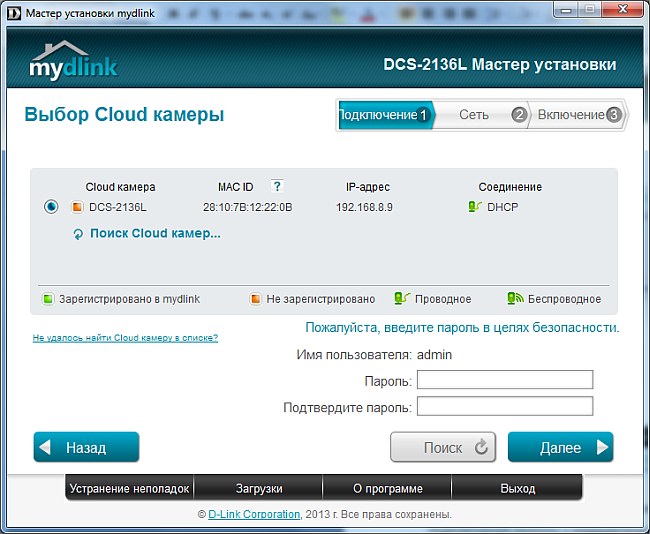 Шаг 2.5: Выберите камеру DCS-2136L из списка найденных устройств. Задайте пароль и подтверждение пароля для учетной записи администратора камеры в соответствующих полях. Этот пароль потребуется для входа в Web-интерфейс камеры. Нажмите Далее, чтобы продолжить.