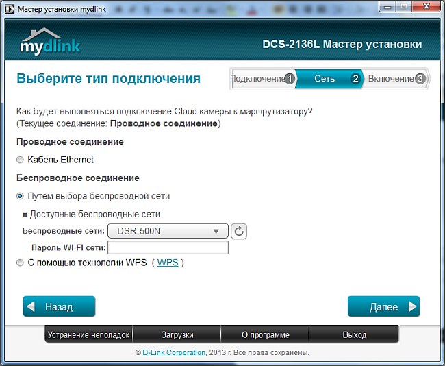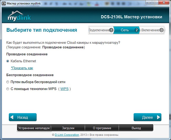 Шаг 2.6: Выберите необходимый способ подключения камеры к маршрутизатору. Можно выбрать проводное соединение, или беспроводное соединение с использованием Wi-Fi Protected Setup (WPS) или выбрать беспроводную сеть вручную. Нажмите Далее, чтобы продолжить.