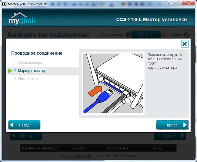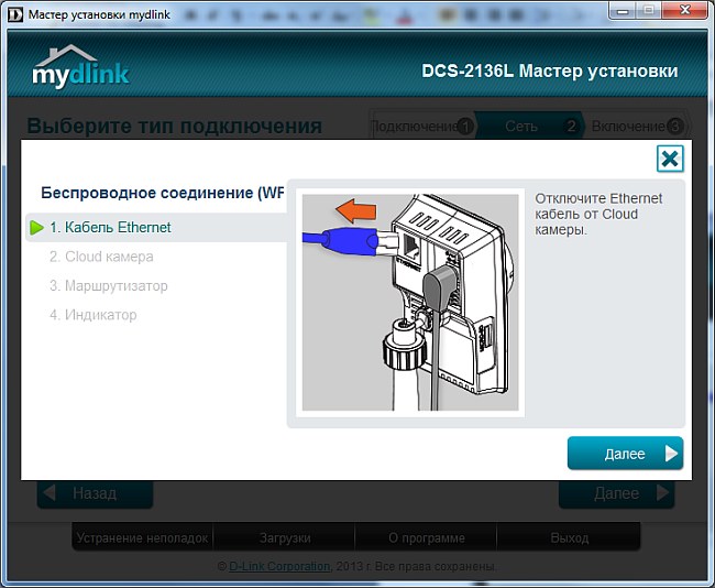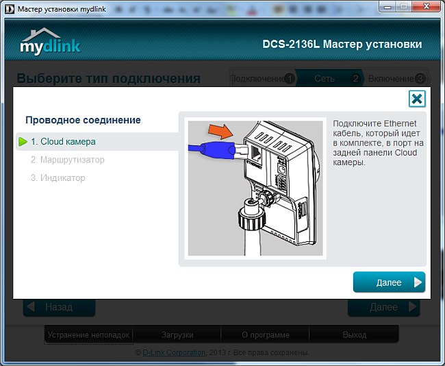 2.6.1  Если Вы выбрали соединение по кабелю Ethernet, следуйте инструкциям на экране, чтобы подключить камеру к маршрутизатору с помощью Ethernet-кабеля. После завершения нажмите Далее, чтобы продолжить.