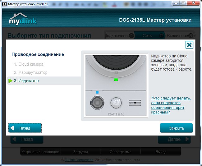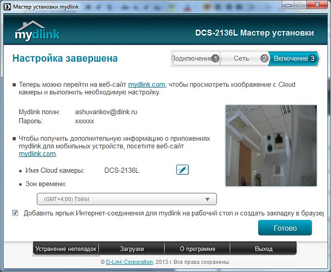 Шаг 2.8: Установка завершена. Итоговая страница отобразит подробные настройки камеры, а также информацию об учетной записи mydlink. Нажмите Готово