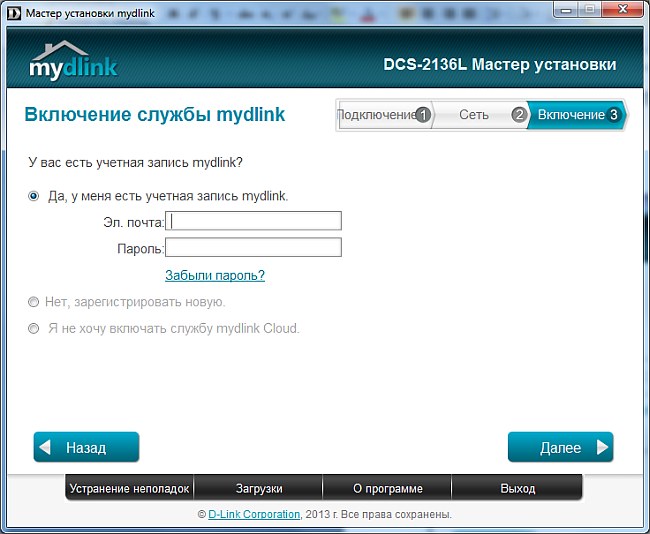 2.7.1: Чтобы добавить DCS-2136L к существующей учетной записи mydlink, выберите Да, у меня есть учетная запись mydlink, затем введите в соответствующих полях имя пользователя (адрес email) и пароль учетной записи mydlink и нажмите Далее.