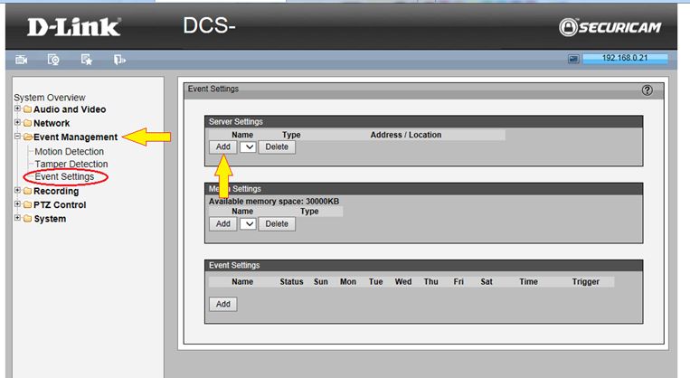 Шаг 4. Далее в разделe Event Management (Управление событиями) перейдите на страницу Event Settings (Настройки события). В окне Server Settings (Настройки сервера) нажмите кнопку Add (Добавить).